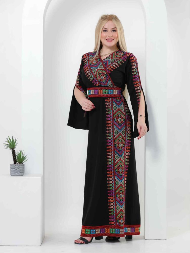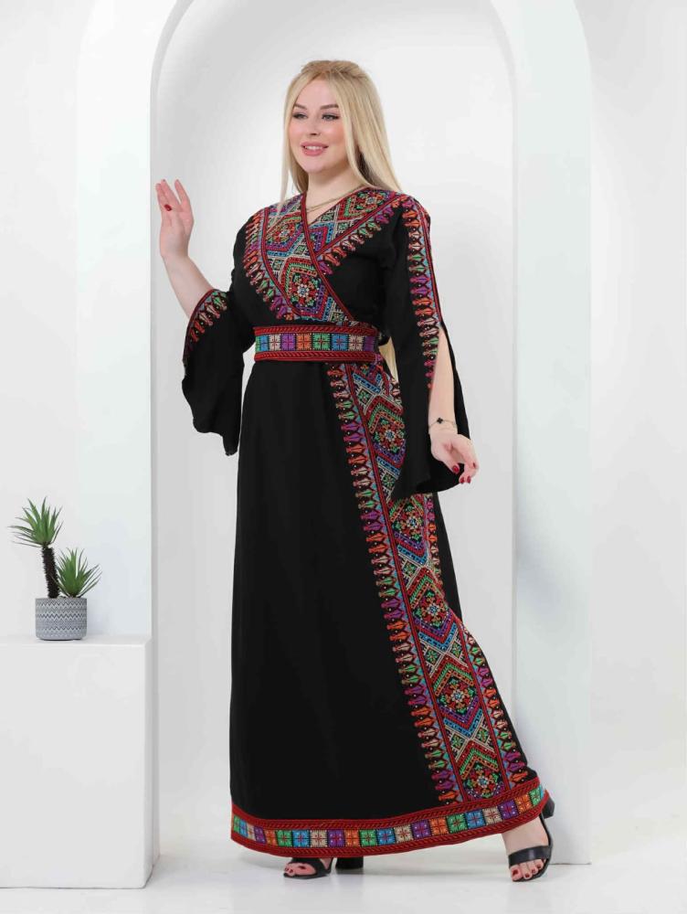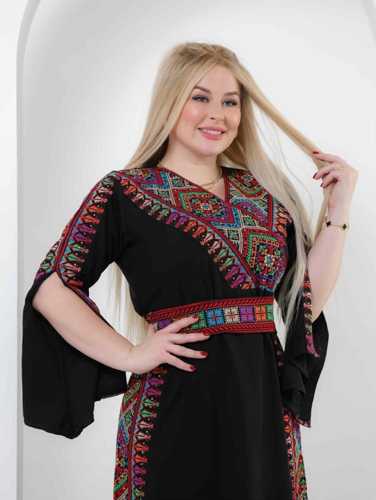 إستمتعي بإطلالة أنيقة تجمع بين الأصالة والأنوثة مع هذه الجلابية الفاخرة المصممة بأسلوب تراثي عصري. تأتي الجلابية بلون أسود ملكي يزيد من فخامة التصميم، ومزينة بتطريز ي فاخر بألوان زاهية مستوحاة من النقوش بألوان تحاكي تراث الوطن، مما يضفي عليها طابعًا ثقافيًا مميزًا.