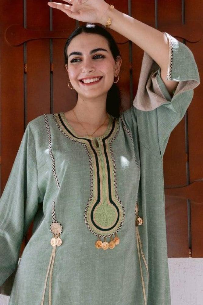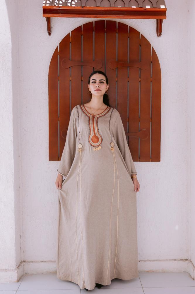 تتميز بتصميمها البسيط والأنيق الذي يعكس جمال الخامات الطبيعية. قماش الكتان الخفيف والناعم يمنحك شعورًا بالراحة والانتعاش، مما يجعلها خيارًا مثاليًا للأجواء الحارة والمناسبات اليومية. تمتاز بتفاصيل دقيقة تضيف لمسة من الجاذبية والذوق الراقي، مما يجعلها قطعة تجمع بين العملية والأناقة في إطلالتك.