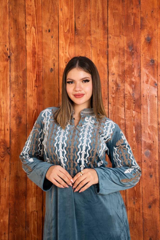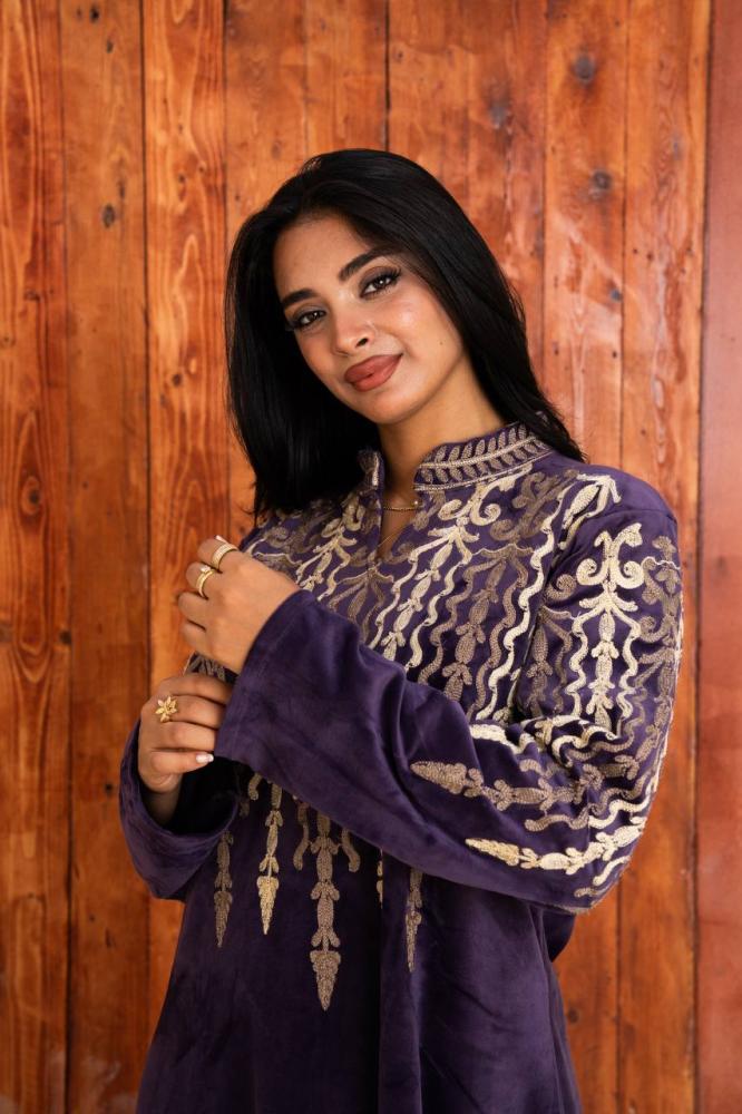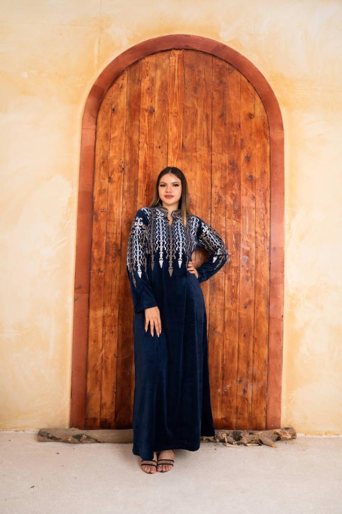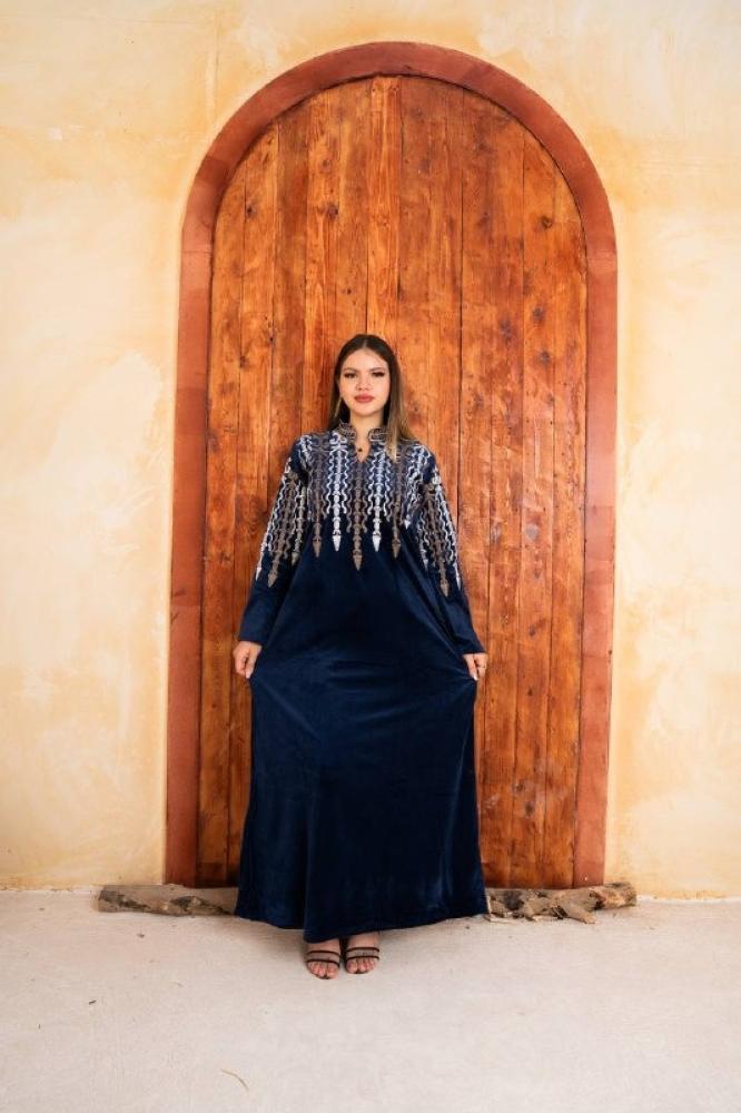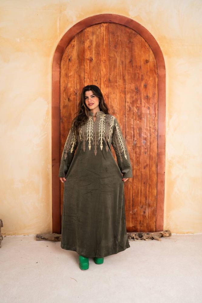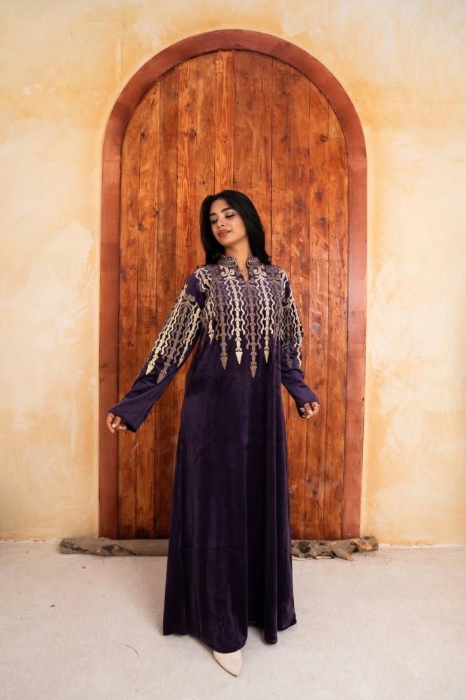 جلابية خامة مخمل ناعمة، وتطريز فخم يعطي لمسة كلاسيكية حديثة بنفس الوقت. مثالية للسهرات والزيارات الراقية
