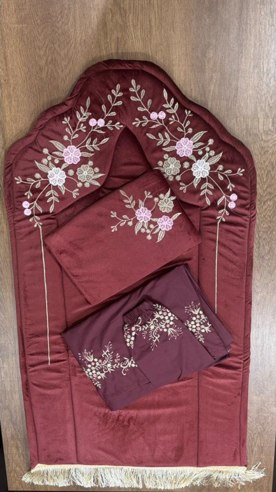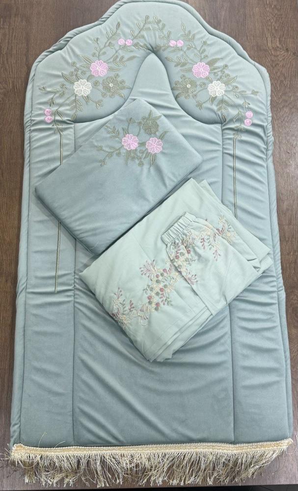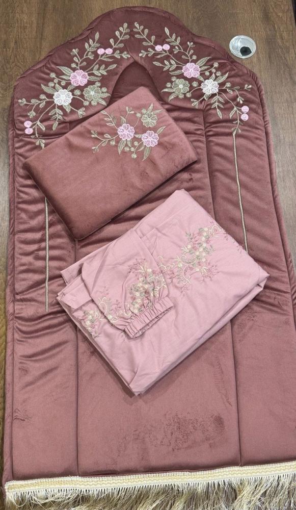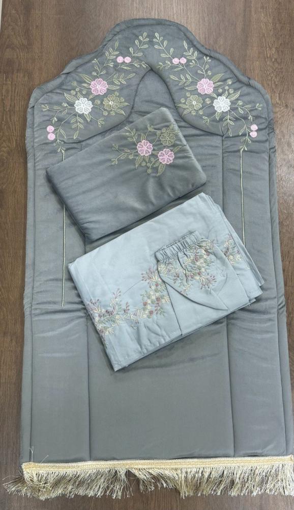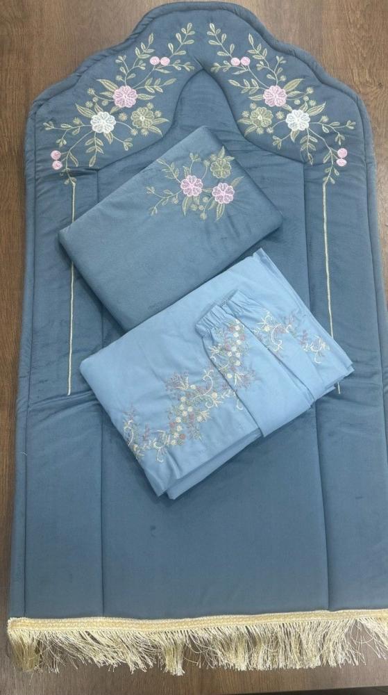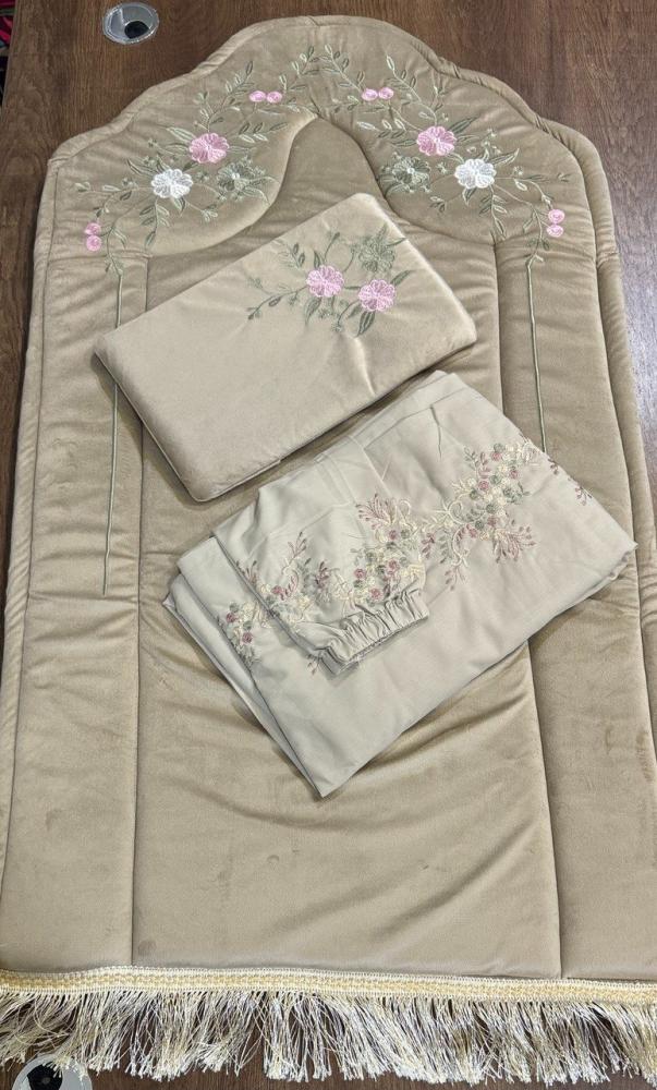 - شرشف صلاة مطرز بتطريز ناعم يتناسق مع السجادة، ويتميز بأكمام مطاطية لراحة الاستخدام.
